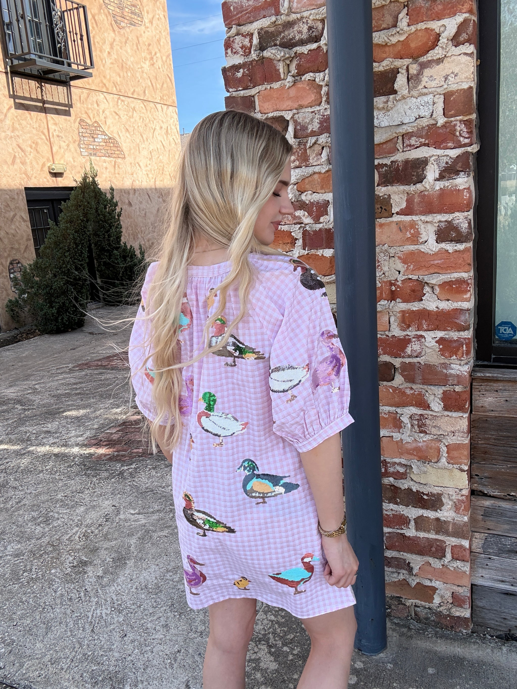 Twirl into the spotlight in this adorable light pink gingham dress, where scattered duck buttons add a whimsical touch. Crafted...