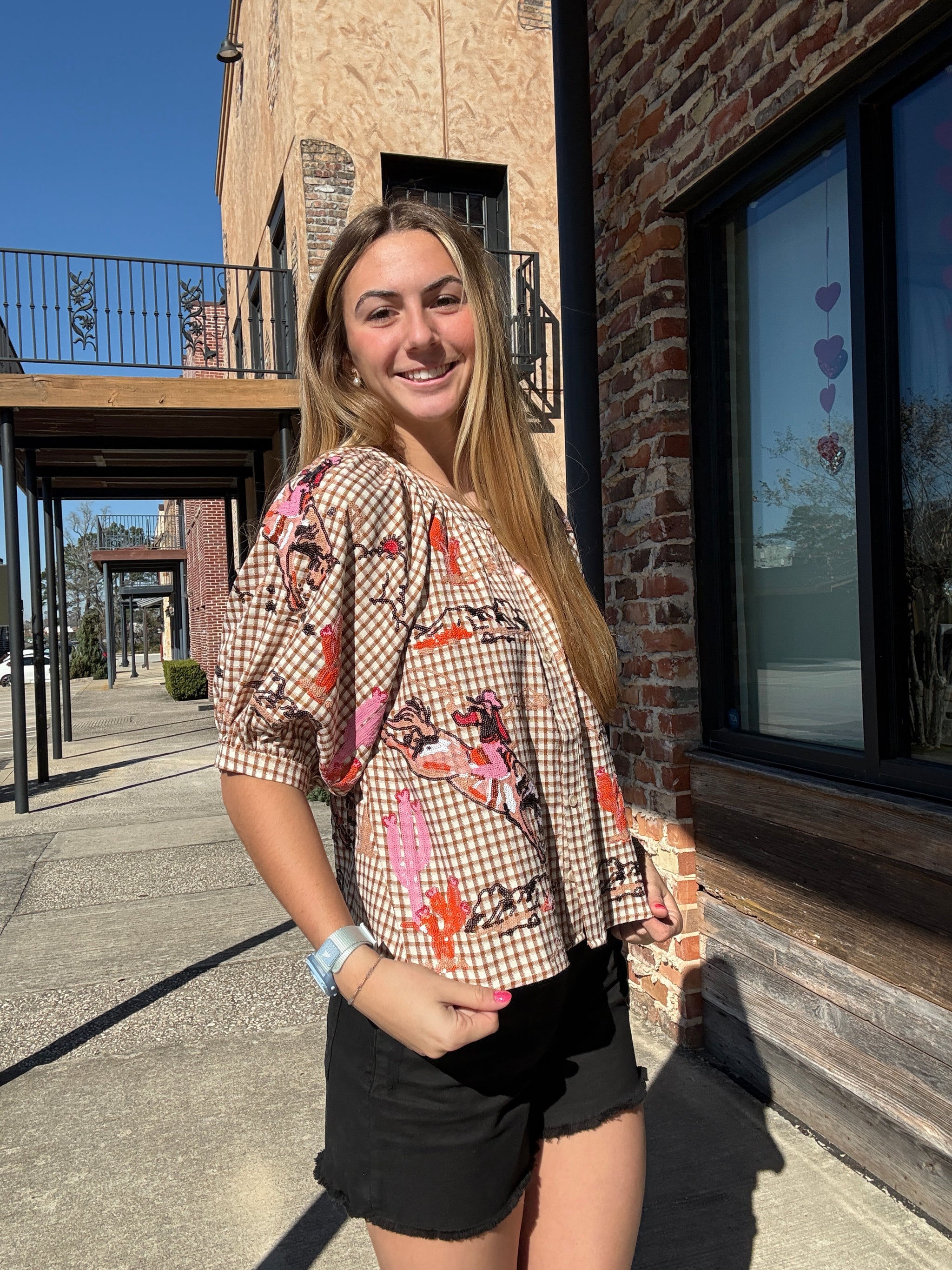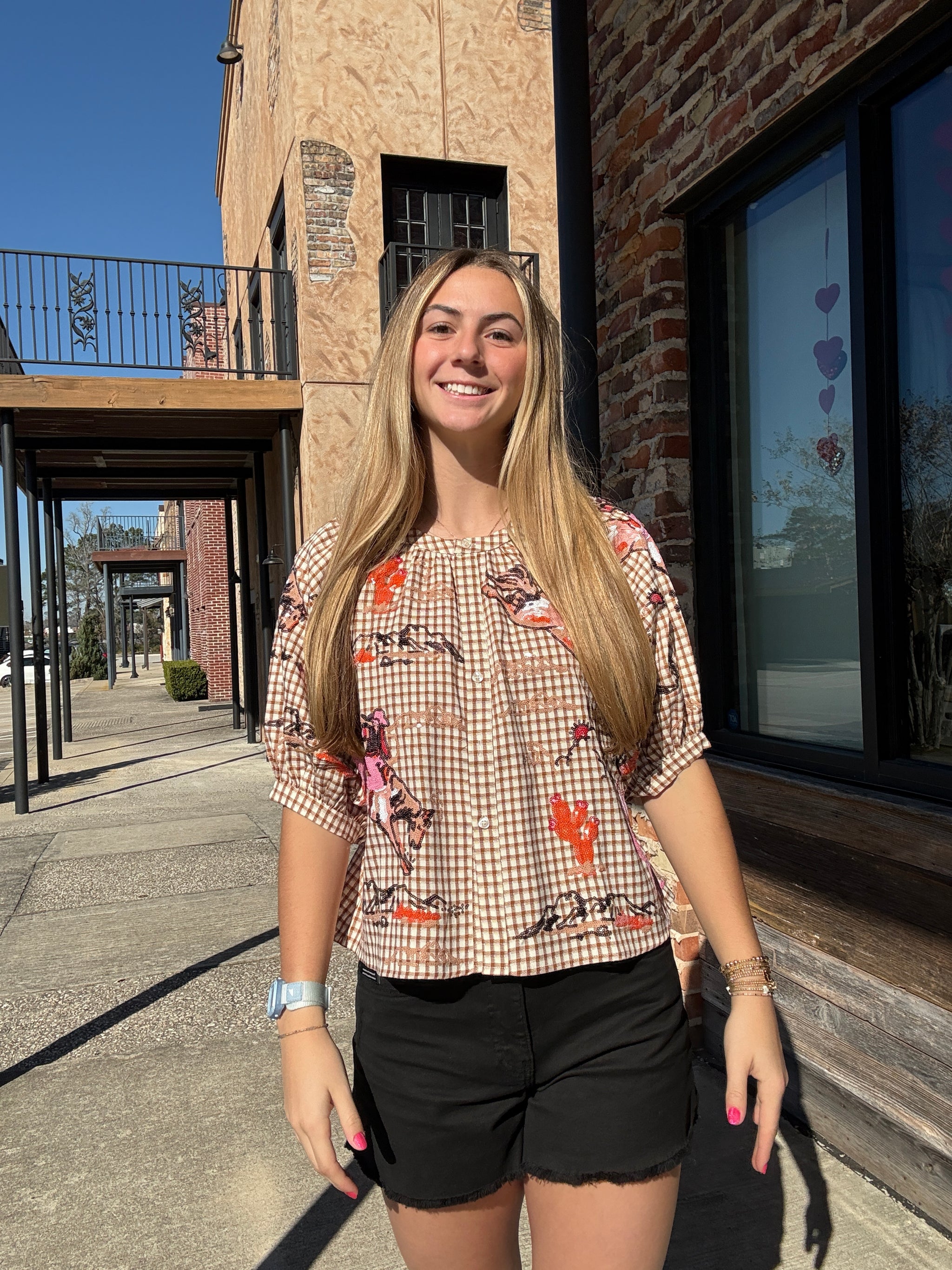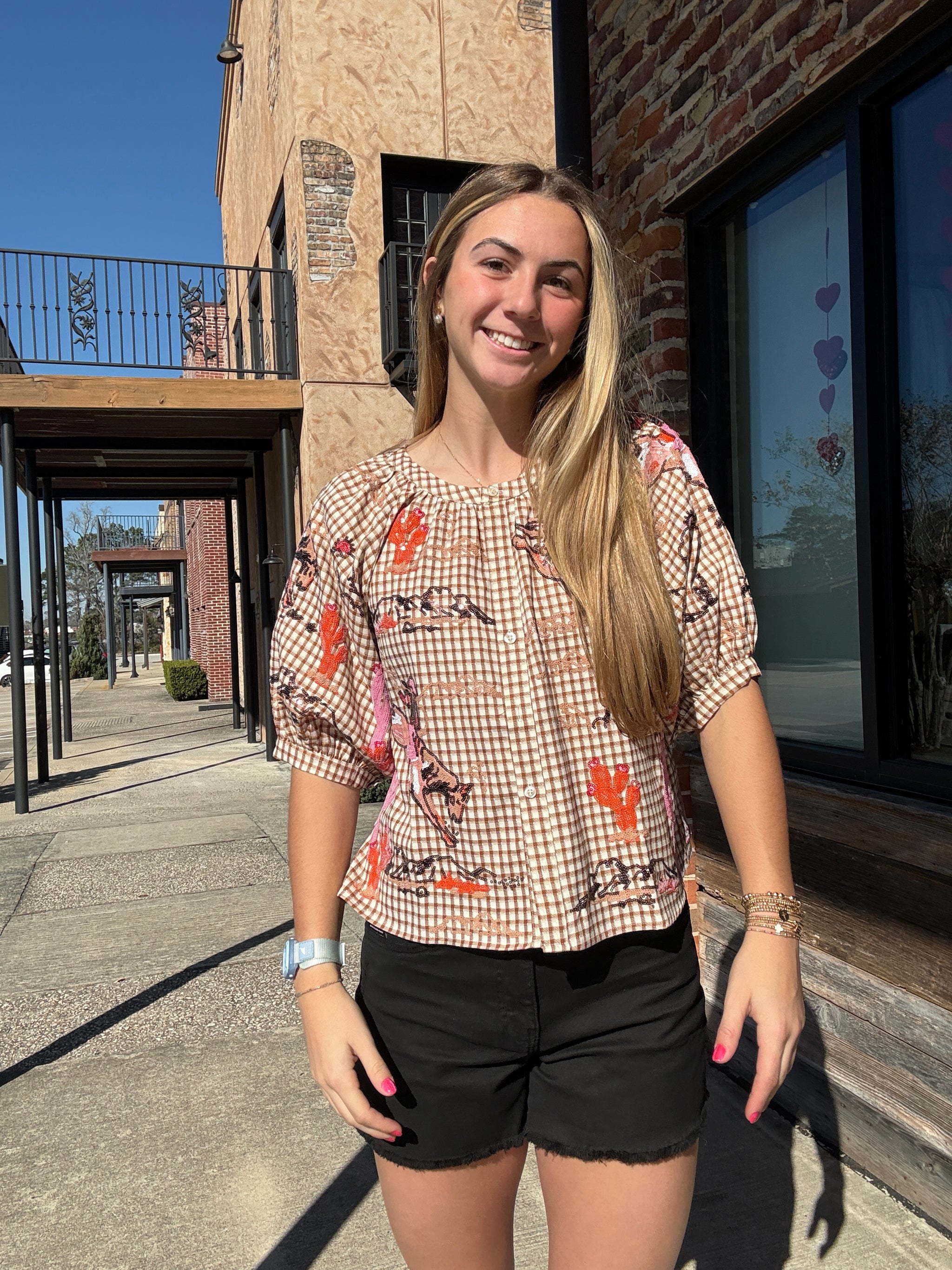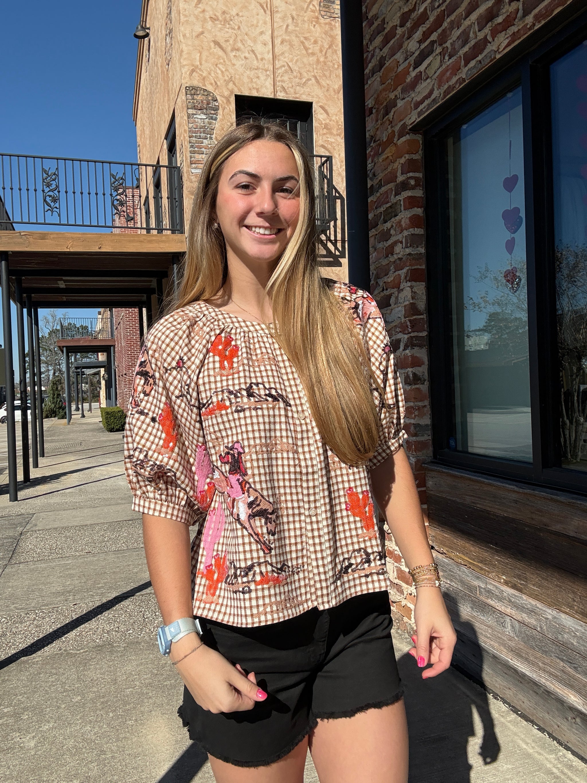 Saddle up in style with this Queen of Sparkles brown gingham button-up that brings rodeo glamour to everyday wear. Crafted...