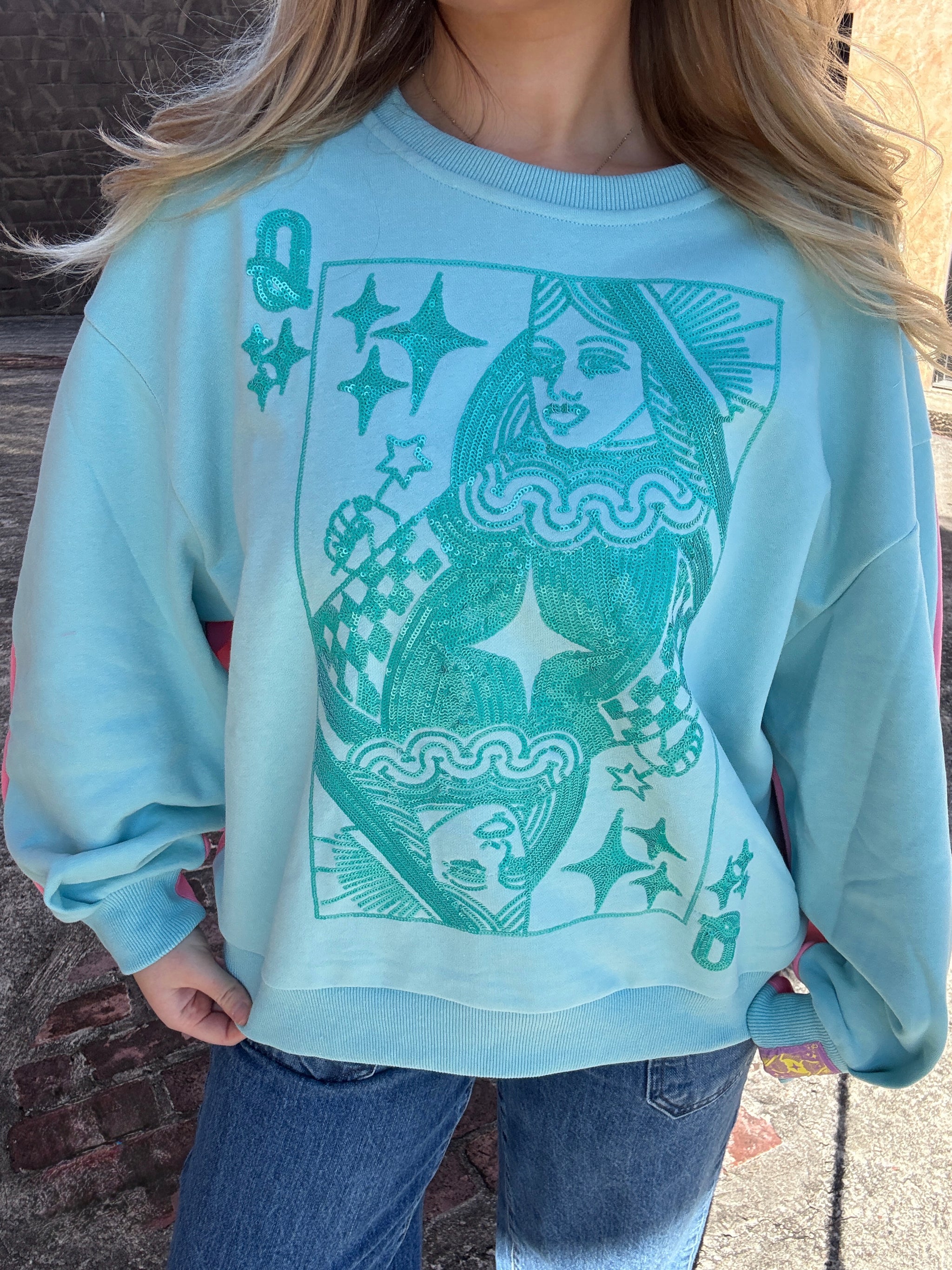 Reign supreme in this dazzling aqua sweatshirt that's pure royalty. Adorned with shimmering sequins and sparkles, this Queen of Sparkles...