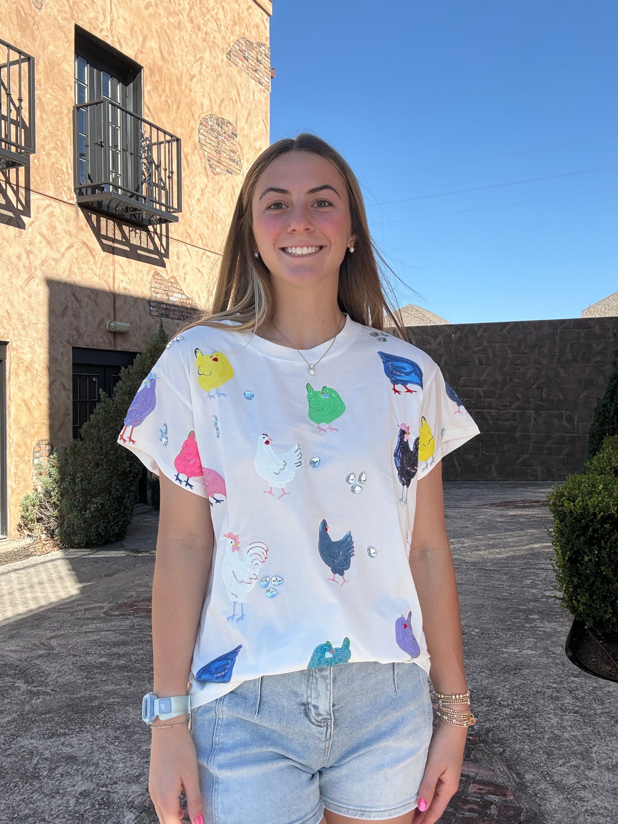 Strut your stuff in this dazzling Queen of Sparkles White Multi Chicken Tee! Adorned with shimmering sequins and jeweled details,...