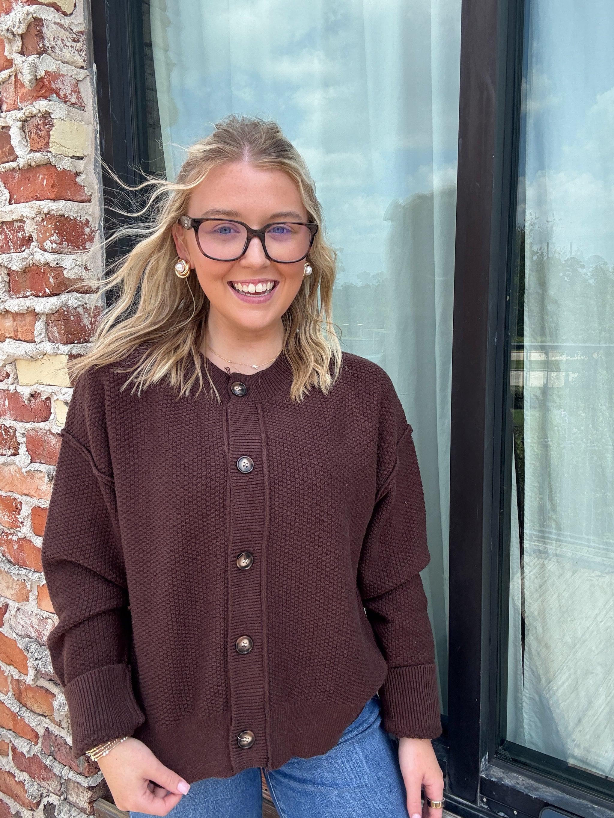 Wrap yourself in cozy charm with the Cocoa Sweater, a playful twist on the classic button-down cardigan. Crafted from soft knit fabric, it features a unique exposed seam detail that adds a touch of quirky style. Perfect for layering, this sweater blends comfort and fun to keep you warm and effortlessly chic all season long.