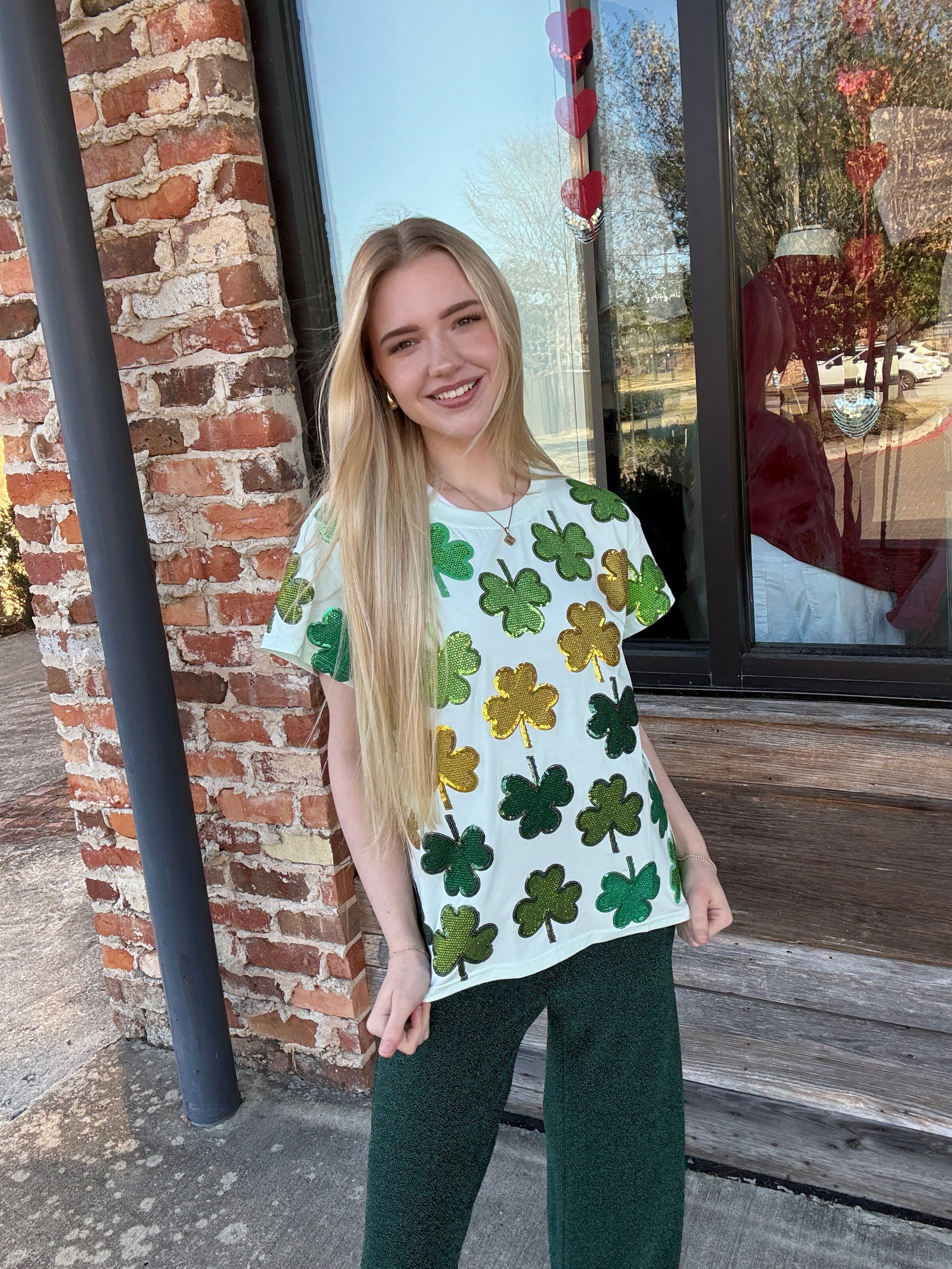 Shine bright this St. Patrick's Day in our Queen of Sparkles Light Green Rhinestone Shamrock Tee! Dazzling rhinestones and shimmering sequins create an eye-catching shamrock design that celebrates the luck of the Irish in style. Perfect for parades, parties, or anyone who loves a little extra sparkle. This playful tee combines festive spirit with glamorous flair—because why blend in when you can sparkle?