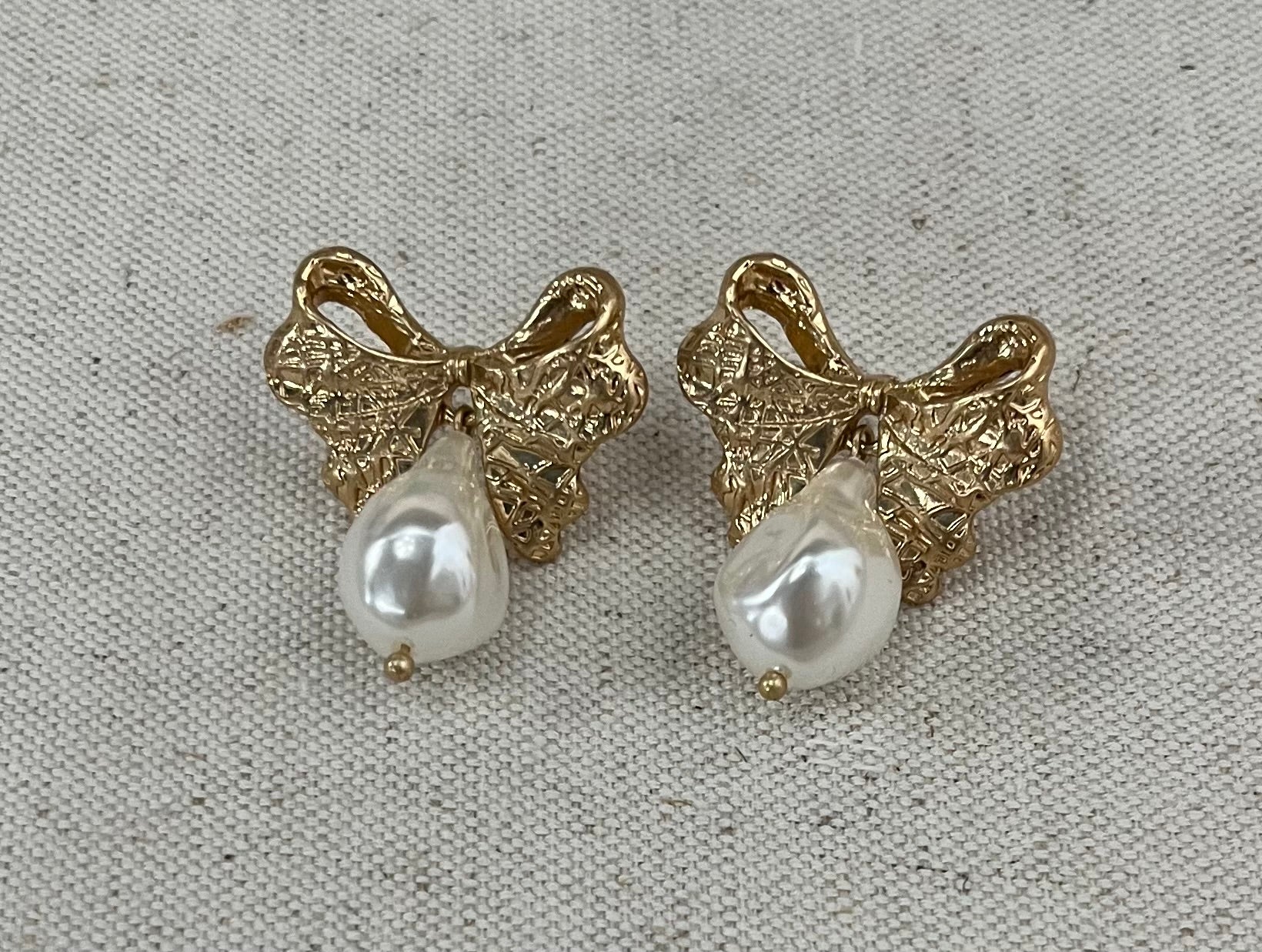 Add a touch of charm and elegance to your look with these Pearl Bow Drop Earrings. Featuring a delicate bow...