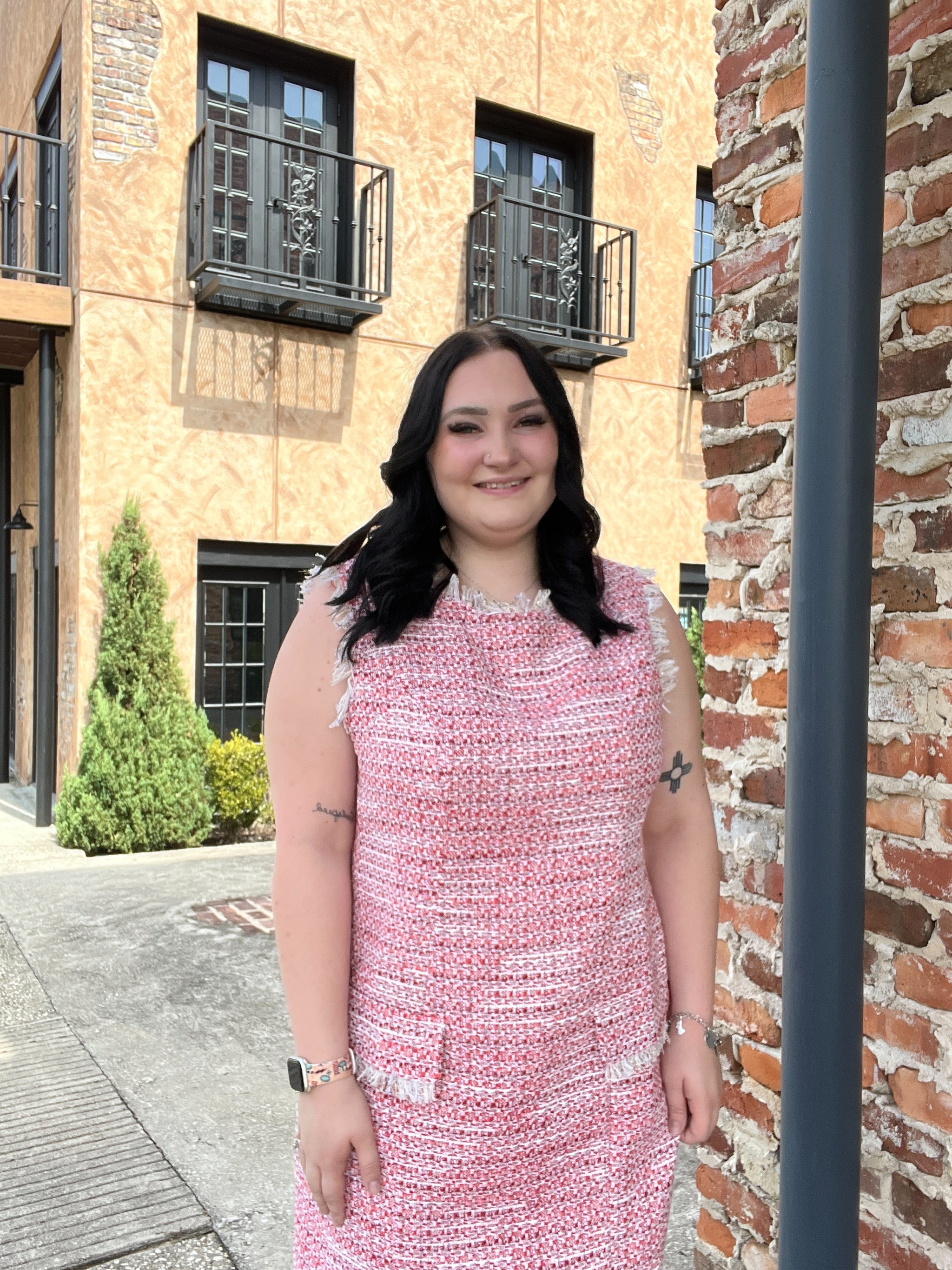 This stunning dress features a stunning red and white tweed fabric with a unique frayed hem, making it a true...