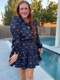 Get your wild side on in this navy blue Prowl Dress! Featuring a playful tiger print ruffle neckline and smocked...