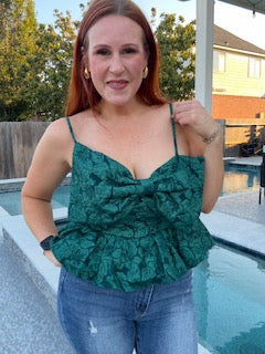 "Get ready for a girls night out with this playful top, featuring an emerald jacquard bow and adjustable straps. The...