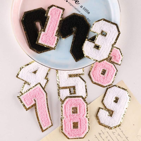 Approximately: 2.25 x 1.5 inchesAdhesive backingMade of chenille fabric and hard gold glitter outlining