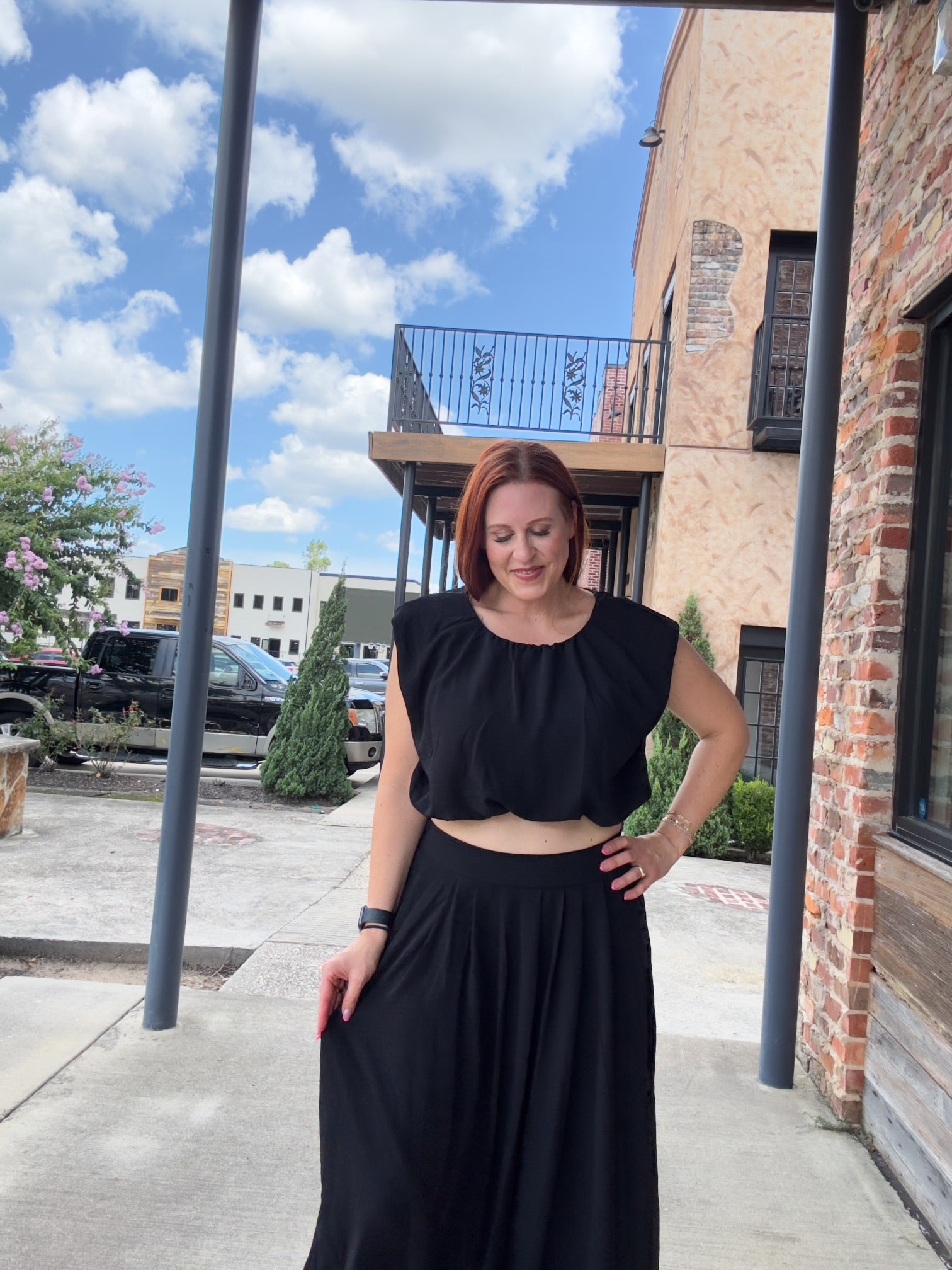 Our Jet Setter Set features a pleated satin fabric top with a round neck, back button with keyhole, and crop...