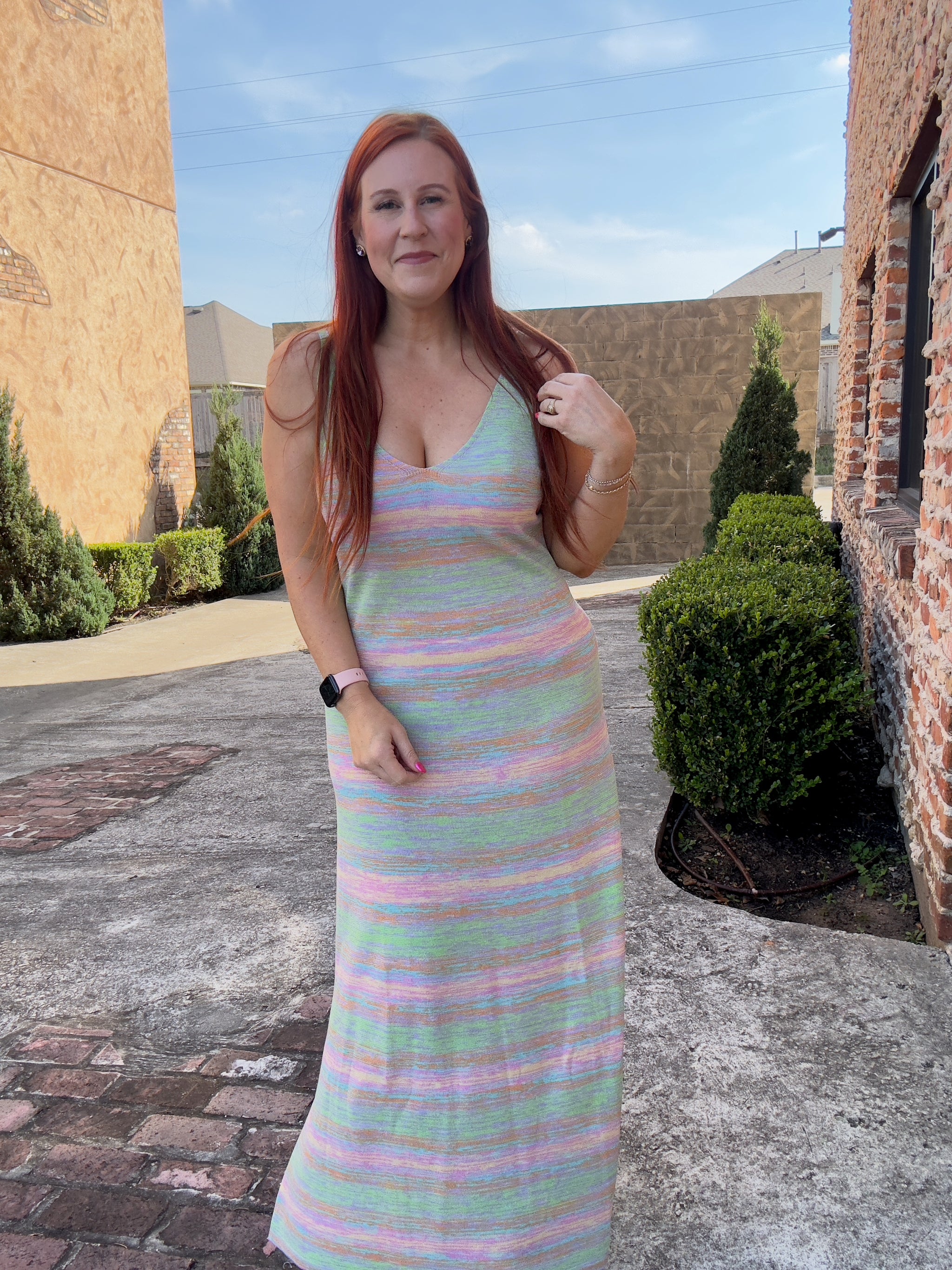 This stunning spaghetti strap dress features a vibrant multicolor pattern that is sure to make a statement. Made with high-quality knit material, this dress offers both style and comfort.
